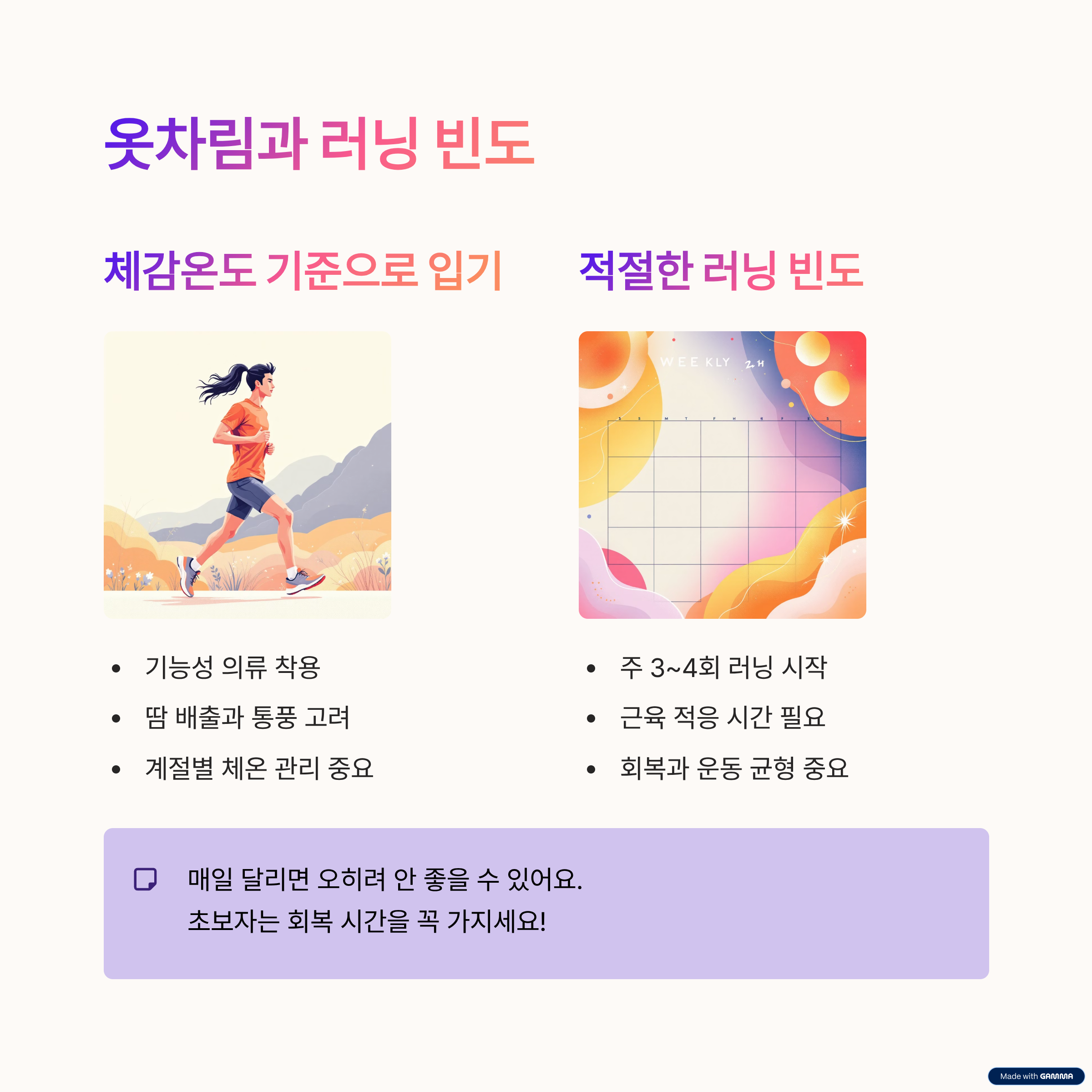 | 장비 | 발에 맞는 러닝화, 기능성 복장 필수 |