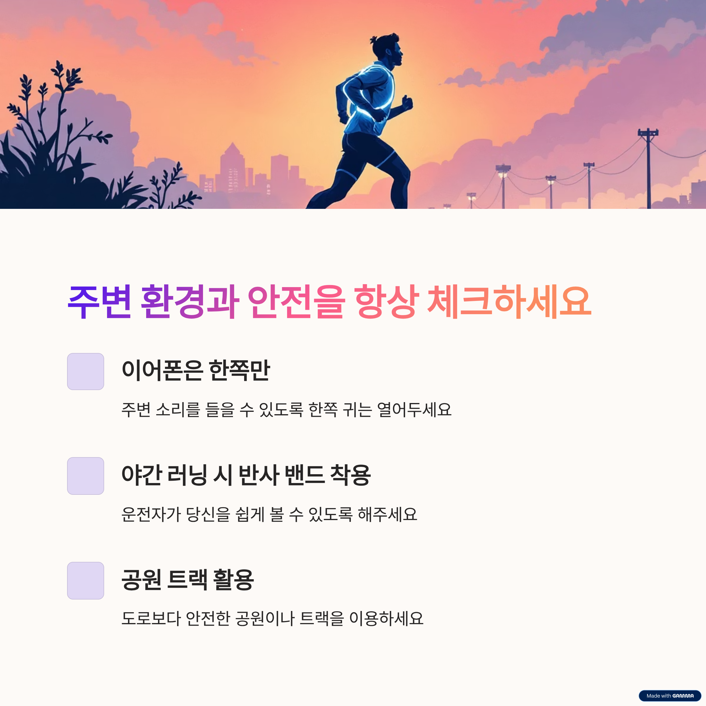 | 안전 | 이어폰 주의, 반사 밴드, 트랙 활용 |