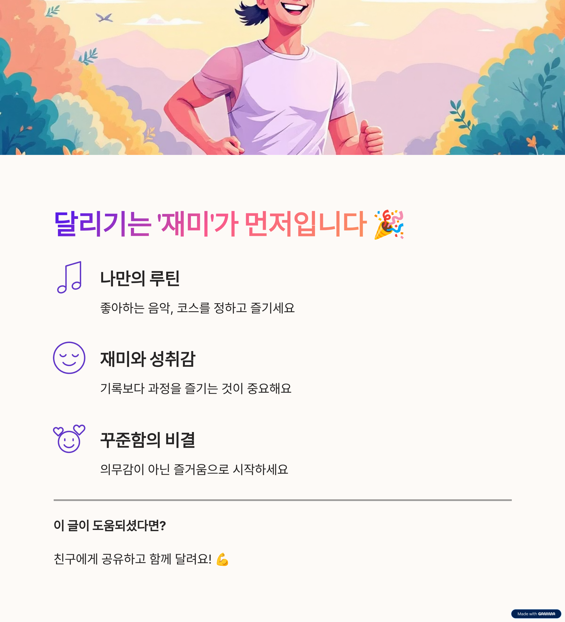| 동기부여 | 기록 앱 활용, 재미 위주 러닝 추천 |